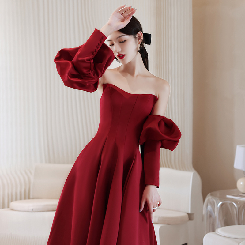 伴娘服冬季新款蝴蝶结亮片一字领气质主持人白色荷叶高腰婚礼婚纱 伴娘服冬季新款蝴蝶结亮片一字领气质主持人白色荷叶高腰婚礼婚纱
