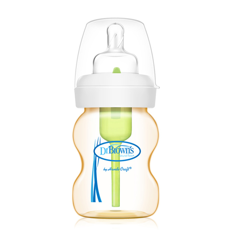 答:由 1个瓶身 1个奶嘴 1个导管 1个助吸器 1个旋盖 1个透明盖。一共是六个部件。