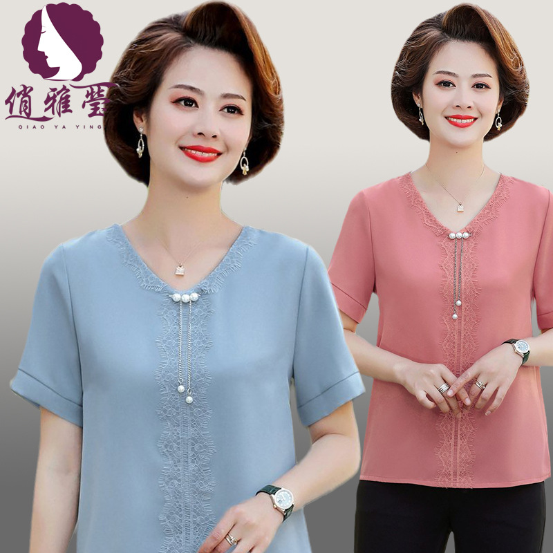 俏雅莹中年妈妈夏装气质套装2022新款短袖t恤中老年女装春装上衣