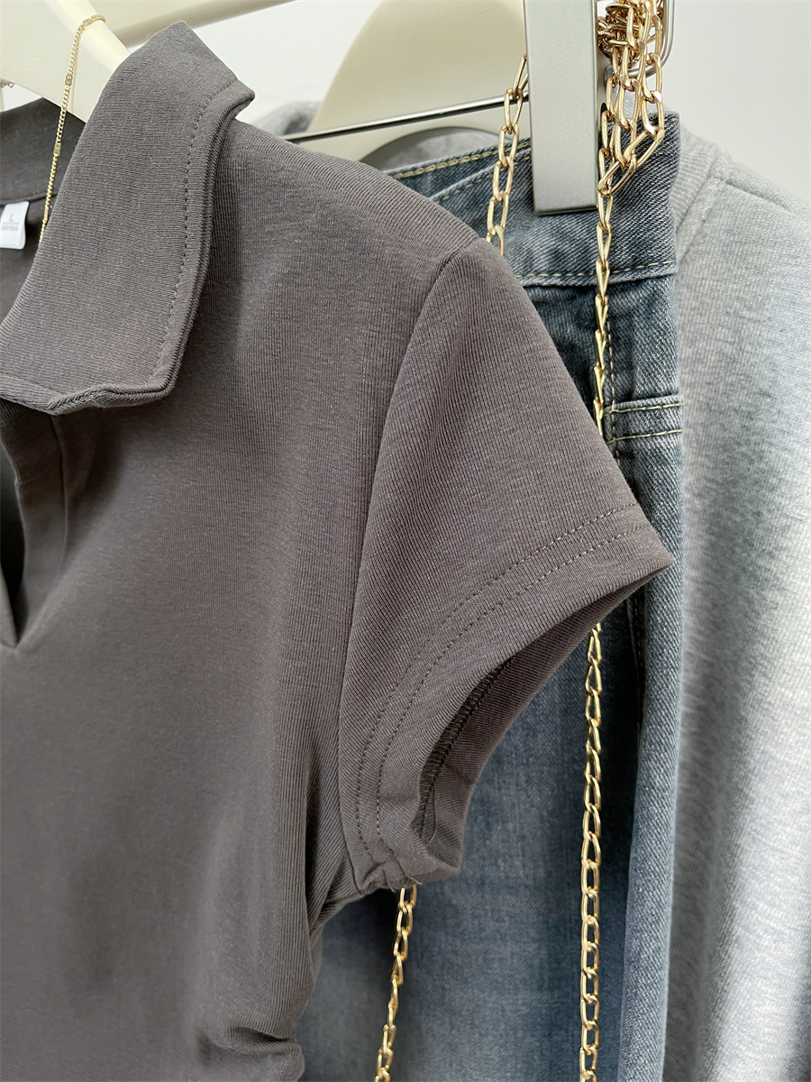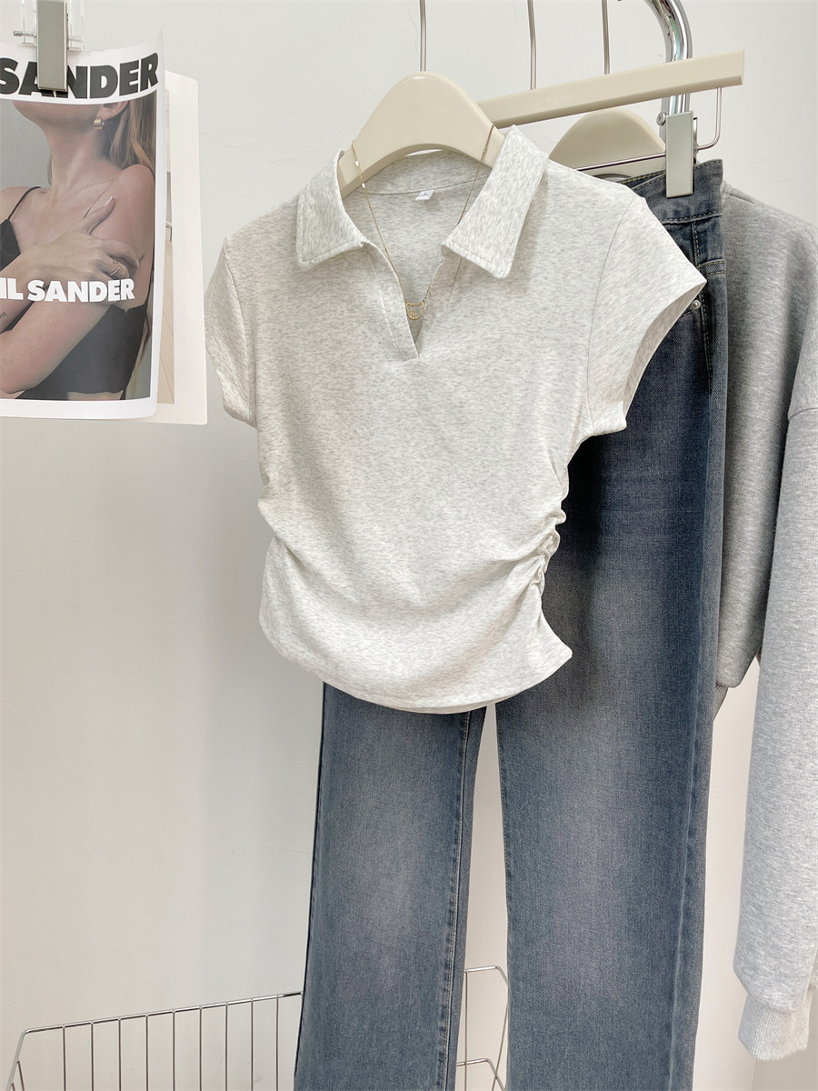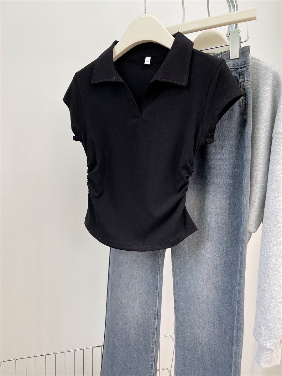 美式复古v领正肩短袖t恤女夏季甜辣收腰弧形下摆短款上衣修身显瘦