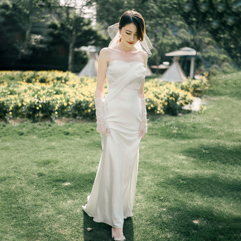 i2 XifKkz9SEOZoquDvgzf/ FUY7t9JAWGYA韩式简约旅拍轻婚纱小个子新娘抹胸缎面迎宾出门纱鱼尾白色礼服女